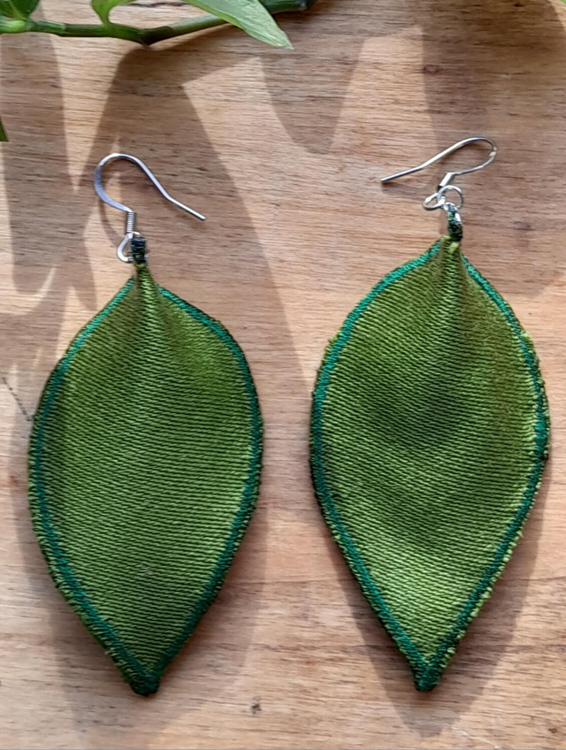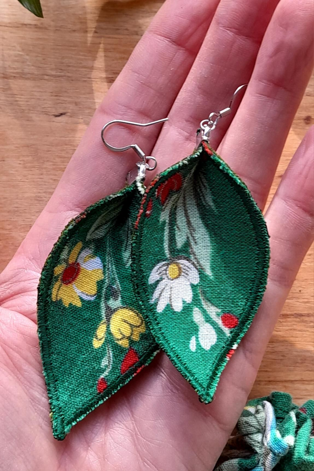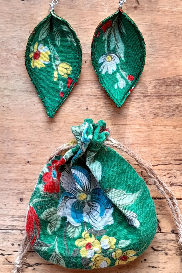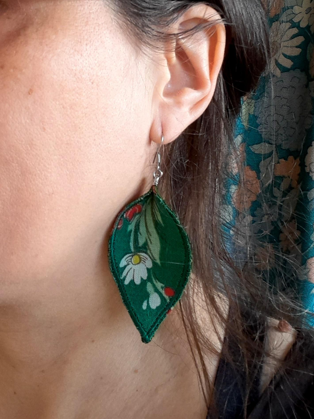 Boucles d'oreilles en tissu réalisées dans une pièce de coton vintage doublée avec une toile d'ameublement vert clair satiné pour leur donner tenue et léger volume. Bords brodés.