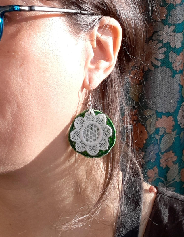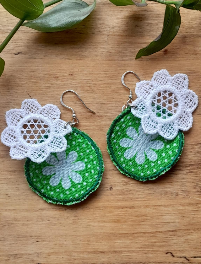 Boucles d'oreilles en tissu réalisées dans une pièce de coton vintage doublée avec une toile d'ameublement vert clair pour leur donner tenue et léger volume, surmontée d'une dentelle fleur. Bords brodés.