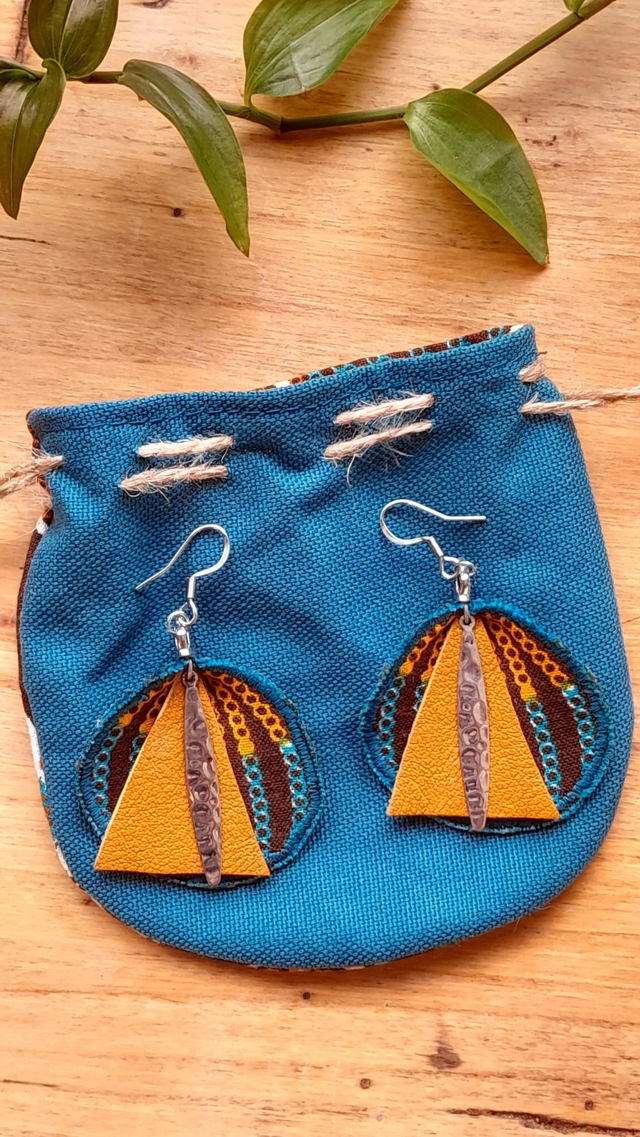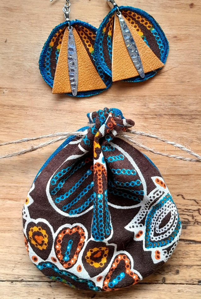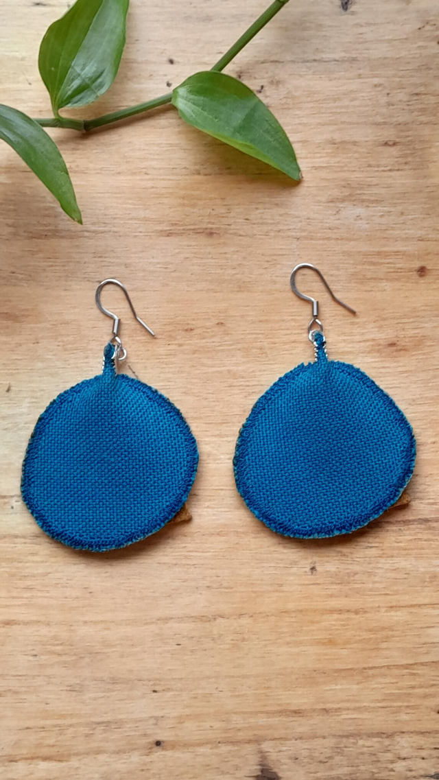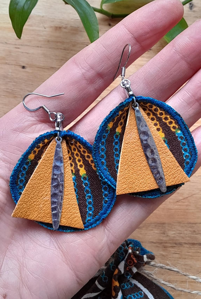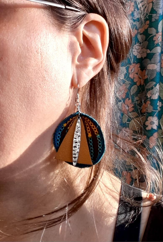 Boucles d'oreilles en tissu réalisées dans une pièce de coton doublée avec une toile bleue turquoise pour leur donner tenue et léger volume. Pièce de cuir et breloque en metal. Bords brodés.